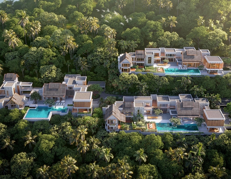 Perched above the sea on a tranquil cliffside, these private villas are woven into a landscape of lush greenery, mountain silhouettes, and endless horizons. Here, rare privacy meets the ease of world-class living — a secluded sanctuary where life flows with effortless elegance and grace.